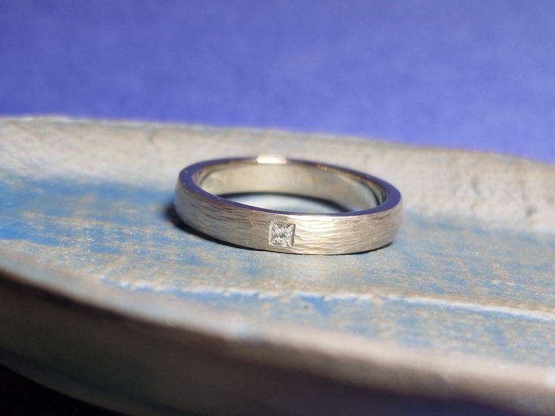 Are you planning a proposal? Looking for the perfect ring? Maybe something like this sleek white gold ‘Rhythm’ men’s ring we created with stripey hammering and a princess cut diamond.