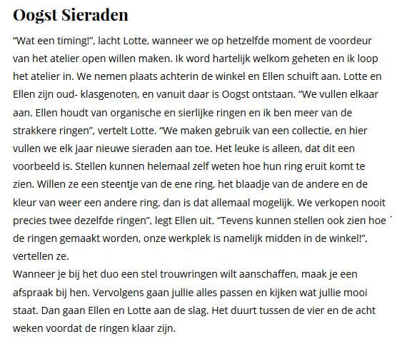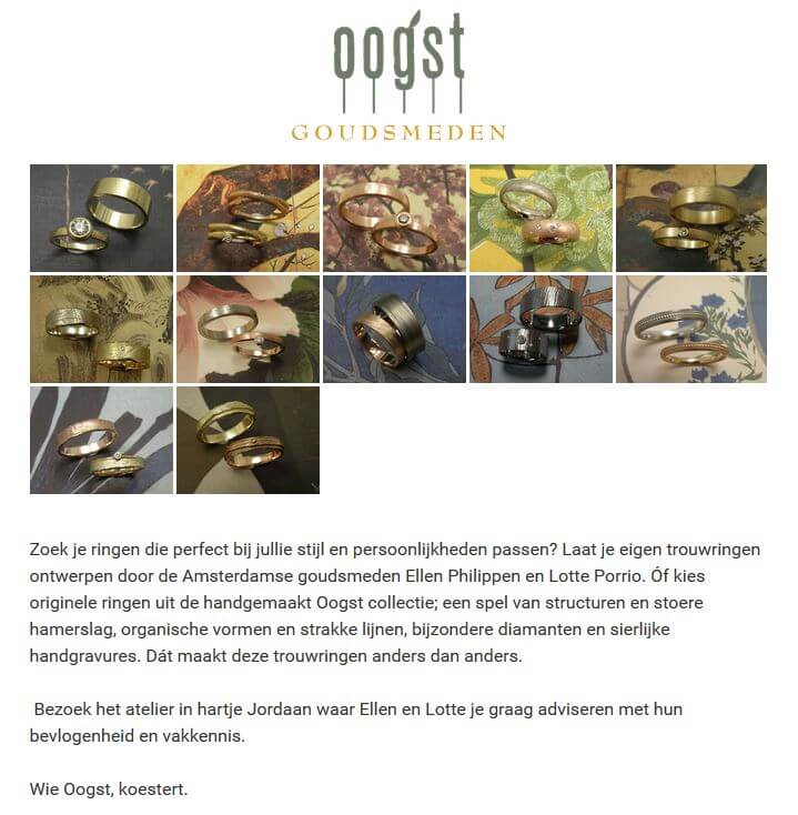 Nieuwsgierig naar alle ins and outs van de Oogst trouwringen? Beluister en bekijk dan deze aflevering van de podcast Echtgenoten. Je ziet er niet alleen voorbeelden van onze kenmerkende texturen, maar ook de kleuren goud waar we mee werken en welke stijlen er zijn in de collectie. Hoe een maatwerk trouwring voor jou ontstaat wordt ook besproken en natuurlijk geven we tips!