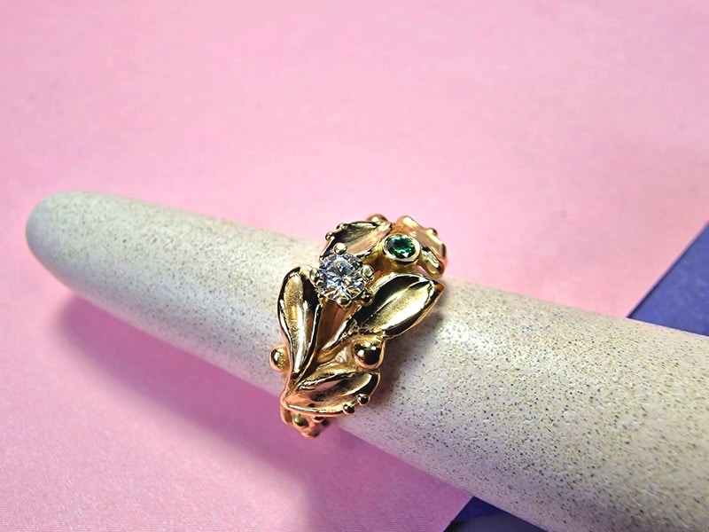 Categorie: Verlovingsring maatwerk Tags: bessen, blaadjes, boomschors, diamant, groen, organisch, ring, roségoud